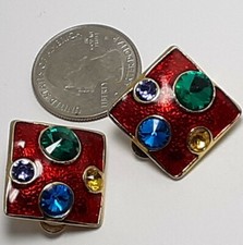 Gorgeous Vintage 80s Multicolored Deep Red Emamal Rhinestone Cabochon Earrings