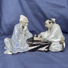 Vintage Chinese Men Playing Board Game Mudman Clay Fgurine Statuette Handcrafted