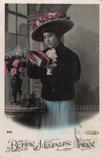 CP HAPPY YEAR WOMAN HAT WITH GIFT NEAR VASE PINK FLOWERS