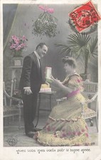 CP UNDER MISTLETOE MUSTACHE IN FRONT OF WOMAN ELEGANT SEAT OPENING GIFT