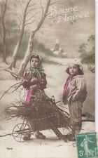 Old postcard fantasy - young children carrying a wooden bundle