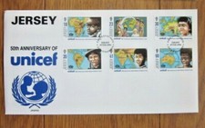 UNICEF 50TH ANNIVERSRAY 1996 6 STAMP SET JERSEY FDC DESCRIPTION ON REVERSE