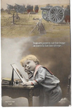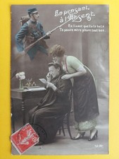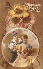 Old postcard military fantasy - happy Easter - little boy thinking of dad soldier