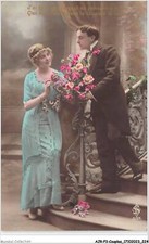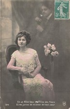 CP WOMAN SITTING NEAR VASE ROSES THINKING ABOUT FIANCE MOUSTACHU