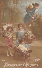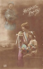 Old postcard Military Fantasy - Happy Easter - Mom and daughter thinking of their soldier