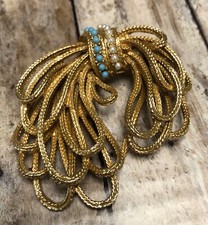 Vintage Gold Tone Brooch With Seed Pearls And Turquouse