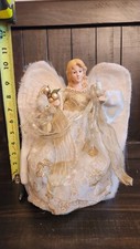 Vtg Christmas Angel Porcelain Face Red Whote Layered Gown Gold Ribbon Wings 12”