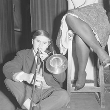 Jazz trombonist songwriter bandleader Chris Barber blows a trombon- Old Photo